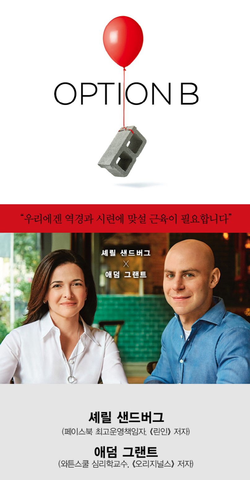 책 "옵션 B"는 개인 이야기들이 모여 강인함과 희망이라는 메시지를 전달하고 있습니다. 이 책은 단순히 자기계발서를 넘어서 독자들에게 공감과 용기를 심어준다고 생각합니다. "옵션 B"는 삶을 살아가는 지혜뿐만 아니라 공감의 손을 내미는 행위로 인하여 강인함이라는 것이 단순한 특성이 아닌 용기와 연결의 의지라는 아주 강력한 메시지를 전달하고 있습니다. 누구나 삶에 있어 우여곡절이 있습니다. 그것이 누군가에게는 잠깐의 고통일 수도 있고 인생의 전환점이 될 수도 있을 것입니다. 성경에 “이 또한 지나가리라”라는 구절이 있는 것처럼 고통은 반드시 지나게 마련입니다. 오히려 그 상황을 연대와 강인함으로 딛고 일어서야 한다는 것을 샌드버그는 경험함으로써 독자들에게 외치고 있습니다. "Option B"는 출간 당시 많은 독자들과 리뷰어들로부터 긍정적인 평가를 받았습니다. 독자들은 특히 셰릴 샌드버그의 솔직하고 감동적인 이야기, 고난에 처한 상황에서의 강인함에 대한 공감, 그리고 구체적인 심리학적인 조언들을 들을 수 있습니다. 이 책으로 충격적인 상황에서 어떻게 자기 회복력을 가지고 인간이 성장할 수 있는지 많은 독자들에게 용기와 영감을 전하고 있다고 평가되었습니다. 샌드버그와 공동 저자인 아담 그랜트 또한 유명한 작가입니다. 이 두작가들이 함께한 인터뷰와 강연을 통해서도 옵션 B에서 전하려는 메시지를 들을 수 있습니다. 이 책이 예기치 못한 상황으로 좌절과 고통을 겪느라 망설이는 이들에게 유용한 도서가 되기를 바랍니다.